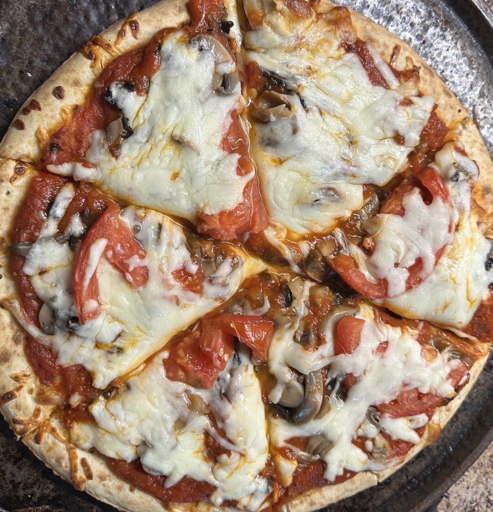 - Add your favorite toppings – I added Mushrooms, Black Olives, and Tomatoes.