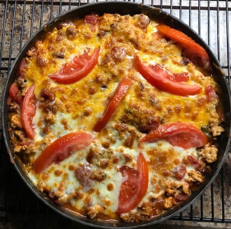 - Remove from stovetop, cover with Shredded Cheese, arrange tomato slices randomly in cheese topping, put in oven and broil until Cheese is nicely browned,
