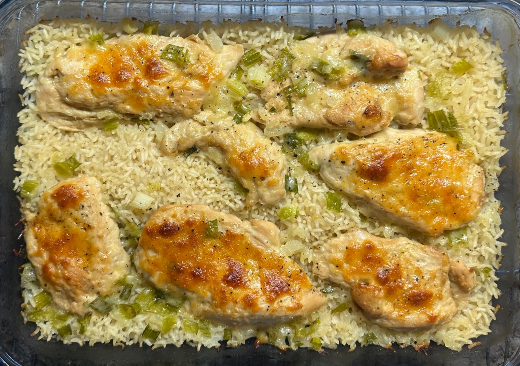 - Add onions (both) and rice to the baking dish and stir to combine.