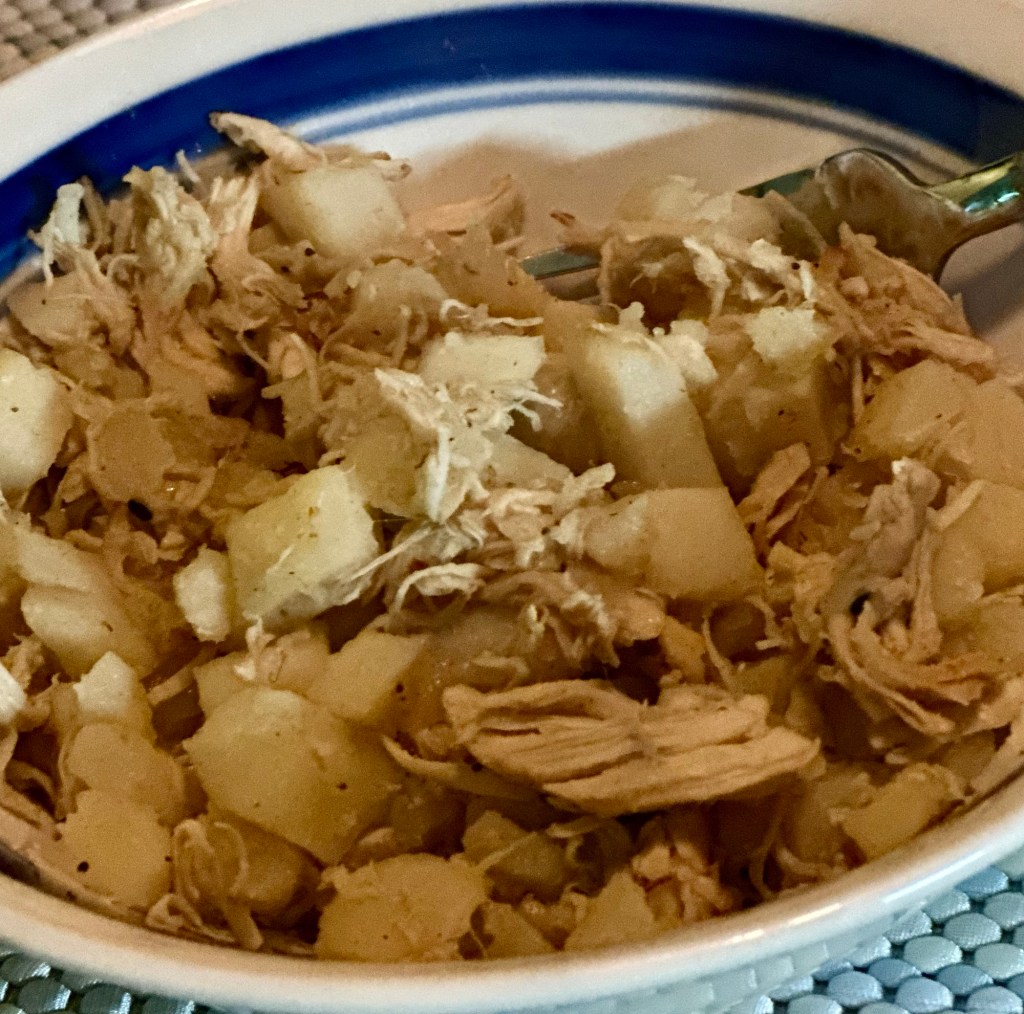 - Add shredded Chicken, cubed potatoes and 1/4 cup of the broth reserved from boiling chicken, cover and cook over medium heat until the water has evaporated, about 7 minutes. Stirring frequently.