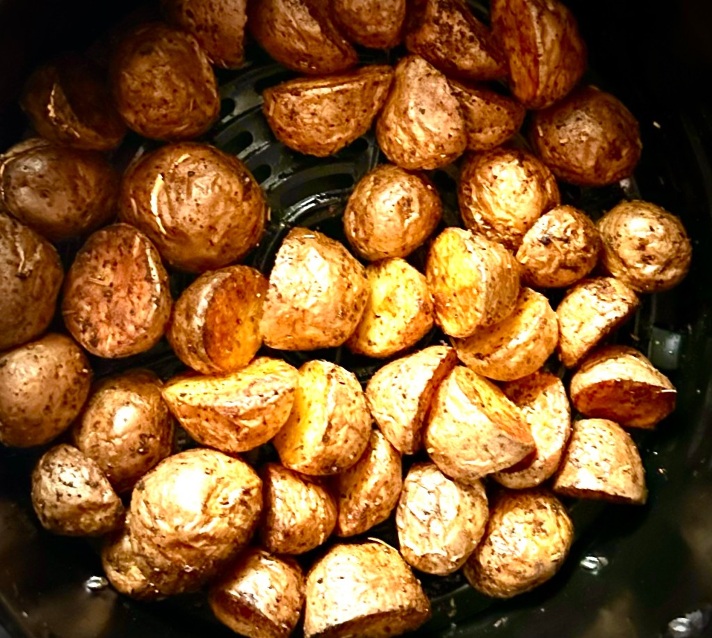 - Place potatoes in basket of air fryer in a single layer and cook at 400° for 10 minutes. Shake basket and stir potatoes, then continue cooking until potatoes are fork tender. About 10 minutes.