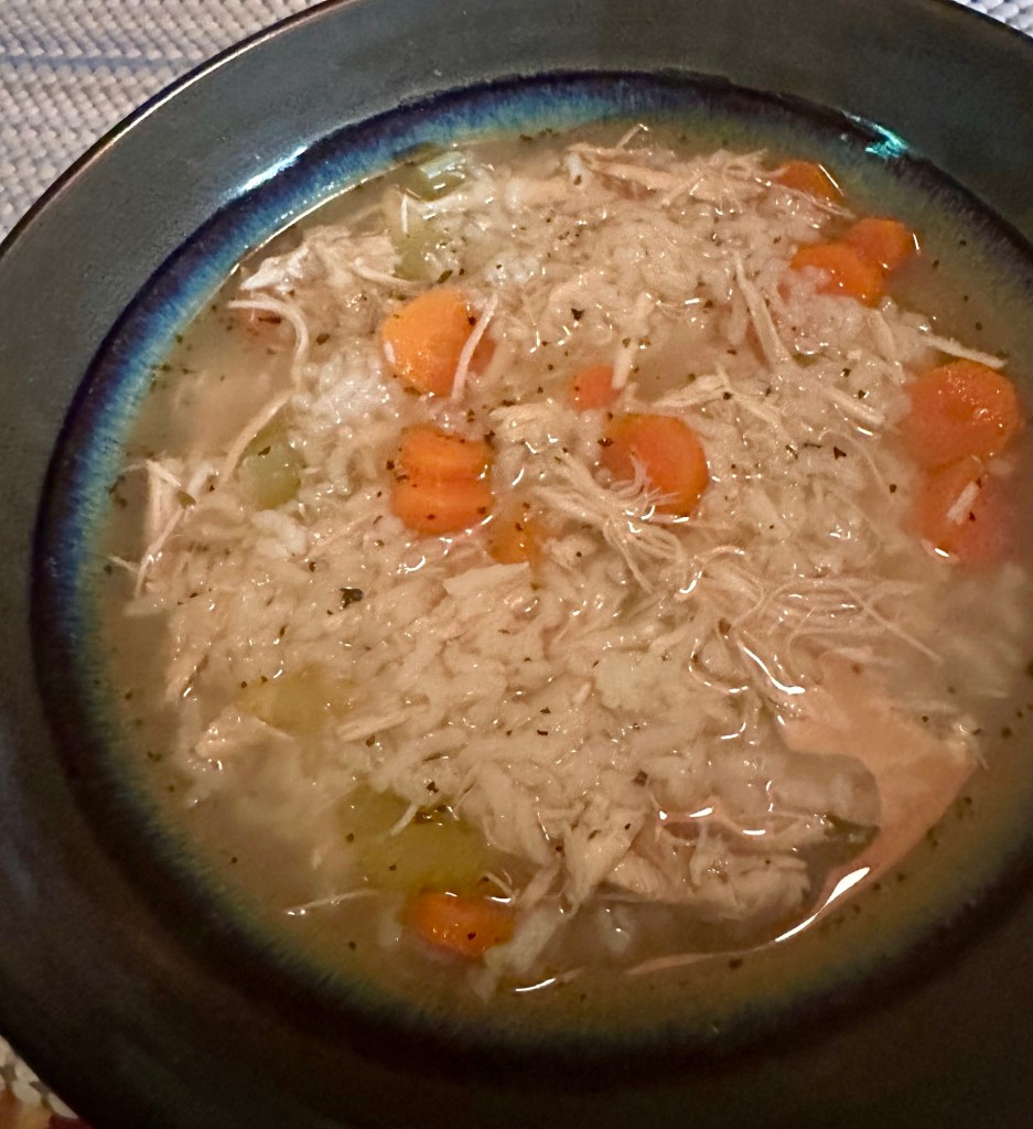 - Add celery, chicken, spices and broth, bring to a slight boil and cook for 1 hour.