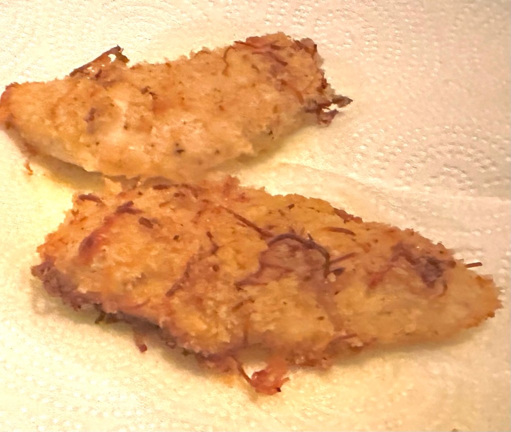 - Dredge the chicken, piece by piece in the Dressing then in the Cheese/Seasoning mixture pressing into the mixture so it sticks to the chicken and both sides.